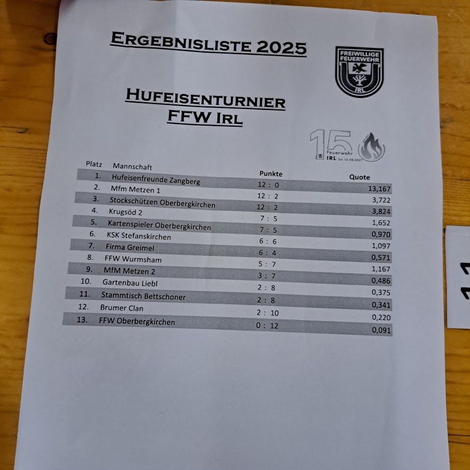 19.10.2025 Am Sonntag fand das letzte Turnier in dieser Saison in Irl statt. Die Freiwillige Feuerwehr Irl organisierte dieses Hufeisenturnier. 13 Mannschaften waren am Start, in 2 Gruppen wurde gestartet. Die Zangberger Moorschaft konnte alle Spiele mit 12:0 und einer Eisennote 13,167 in ihrer Gruppe gewinnen. Somit musste man im Finale gegen den Gruppensieger Mfm Metzen antreten. Im Finale wurden 6 Kehren geworfen, hier konnten sich die Zangberger mit 5:2 durchsetzen und holten sich den Turniersieg in Irl.
